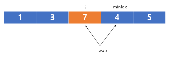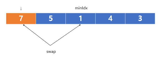 가장 먼저 맨 앞의 7부터 시작한다. 7 뒤의 값들 중 가장 작은 값인 1과 자리를 바꾼다. i는 현재 인덱스, minIdx는 가장 작은 값의 인덱스를 나타낸다.