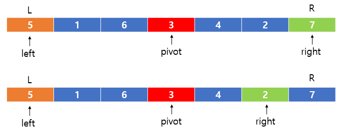 - 중간 값을 pivot으로 설정했다면 가장 왼쪽의 값을 left, 오른쪽의 값을 right로 잡는다. (여기서 L은 배열의 가장 왼쪽, R은 가장 오른쪽의 위치를 나타낸다)