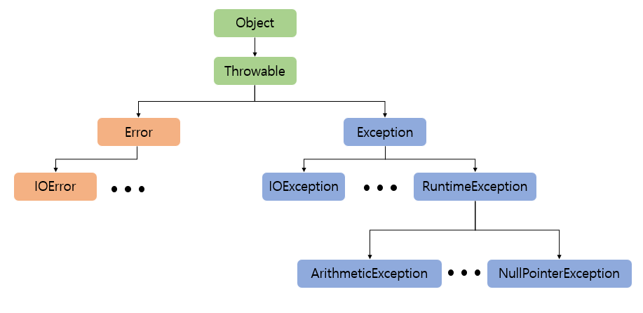 반면 예외(exception)는 개발자가 구현한 로직에서 발생한 실수 혹은 사용자의 영향에 의해 발생하는 예측하고 방지할 수 있는 문제를 뜻한다.