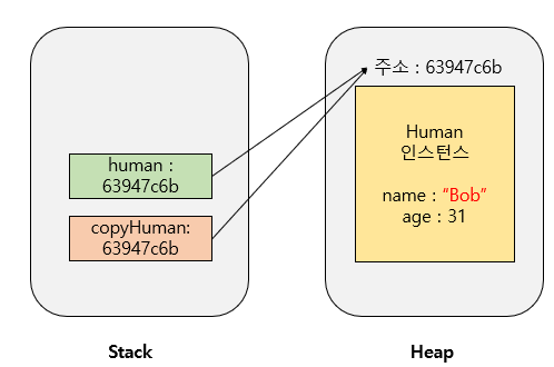 따라서 copyHuman에서 setName() 메서드를 호출해 값을 변경하면, human의 name 값도 변경되는 것이다.