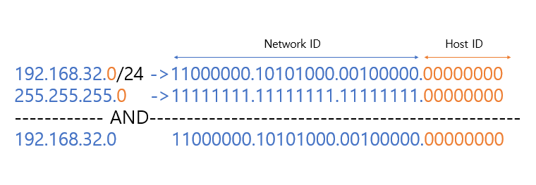 예를 들어 C클래스인 192.168.32.0 이라는 IP주소가 있다고 하자. C클래스의 기본 서브넷 마스크는 255.255.255.0 이므로 AND연산을 하면 192.168.32.0이 나오고 이것이 바로 Network ID이다. 이때 서브넷 마스크의 Network ID부분은 1이 연속적으로 있어야 하고 Host ID부분은 0이 연속적으로 있어야 한다.