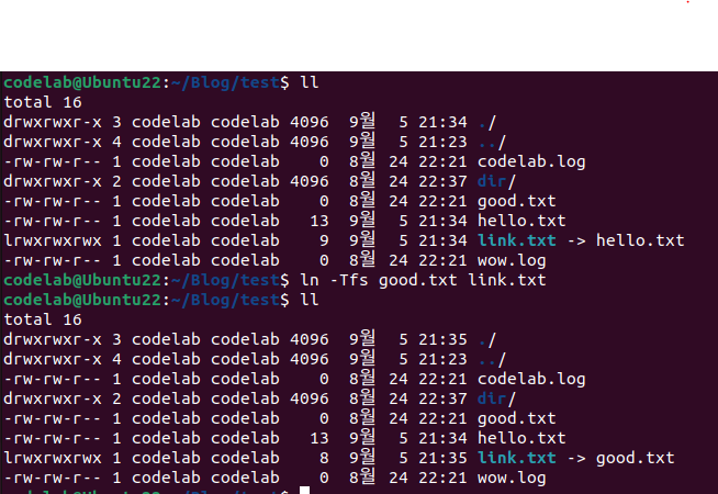 hello.txt를 가리키던 link.txt를 good.txt를 가리키도록 수정했다.