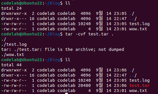 위와 같이 디렉토리를 통째로 아카이브로 묶을 수도 있다. '.' 을 이용해 현재 디렉토리의 모든 파일을 묶을 수도 있다.