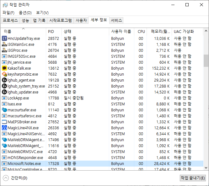 Ctrl + Alt +Del 키를 눌러 작업관리자에 들어가면 세부정보에서 실행중인 프로그램의 PID를 확인할 수 있다.