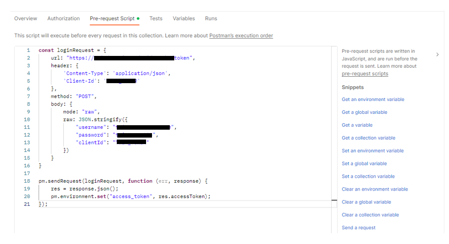 pre-request script를 작성할 때 옆의 Snippets를 활용하면 더욱더 간편하게 스크립트를 작성할 수 있다.