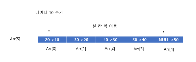 위와 같은 상황에서 Arr[0] 에 데이터 10을 추가하기 위해서는, Arr[0] 부터 Arr[4] 까지 모든 원소가 한 칸 씩 오른쪽으로 이동하게 된다.