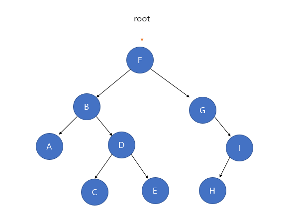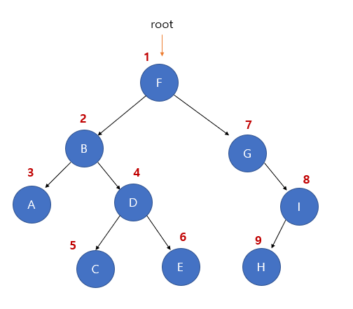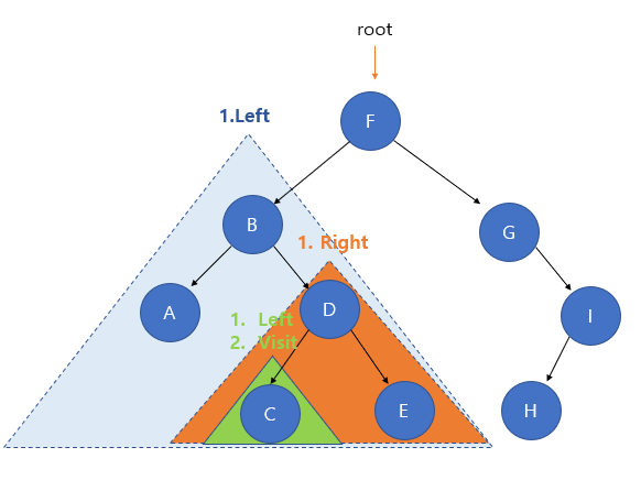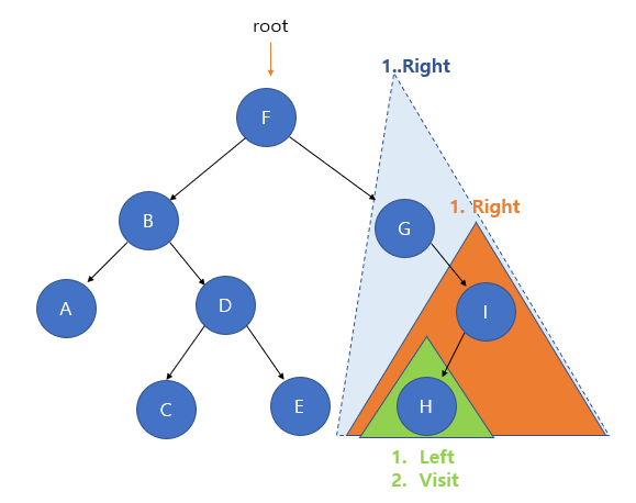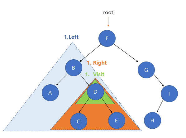 F 노드가 루트 노드일 때 왼쪽 서브 트리의 탐색이 모두 완료되었으니, 루트 노드인 F를 방문한다.