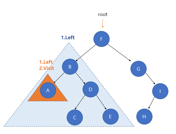 B노드가 루트 노드인 것처럼 되고, 왼쪽 서브 트리인 A노드로의 중위 탐색이 진행된다. 이후 A노드는 왼쪽 서브 트리(Left)가 없으므로 해당 노드를 방문(Visit) 하게 된다.