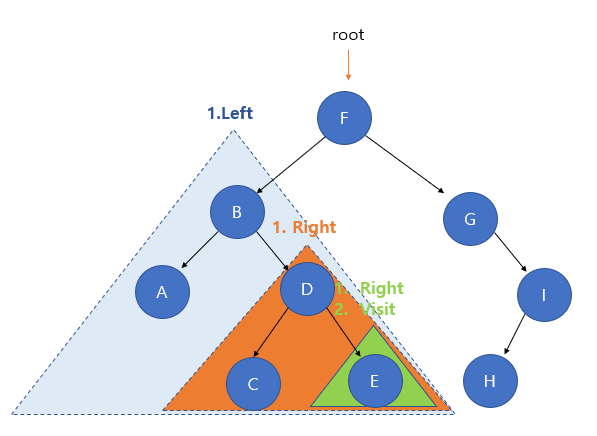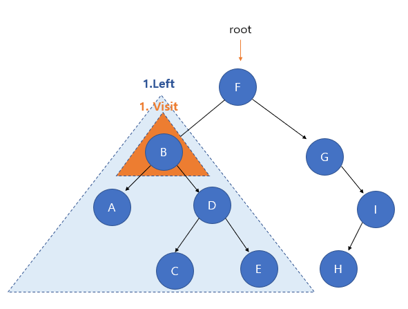 B가 루트 노드인 것처럼 될 때 , 왼쪽 서브 트리의 탐색을 마쳤으니, 루트 노드인 B의 방문(Visit)이 진행된다.