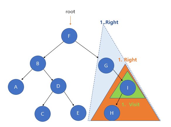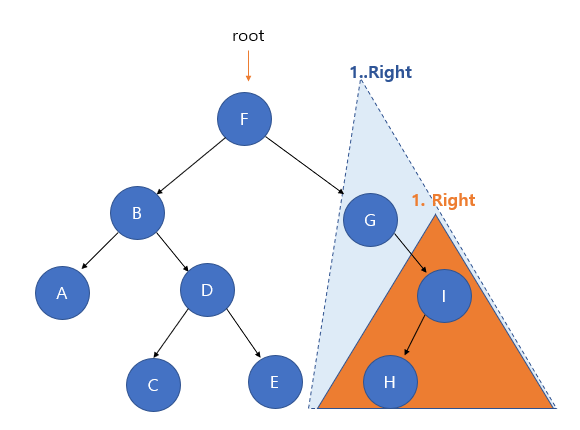 이후 오른쪽 서브 트리로 다시 중위 탐색이 진행된다. 이때 I 노드가 루트 노드인 것처럼 된다.