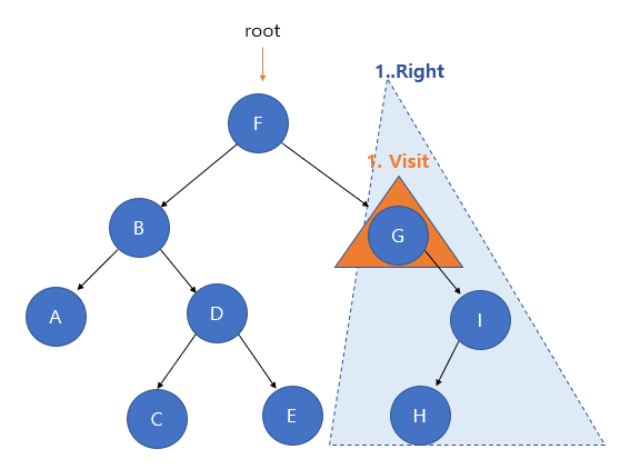 G노드가 루트노드 일 때, 왼쪽 서브 트리가 없으므로 루트 노드인 G노드를 방문한다.