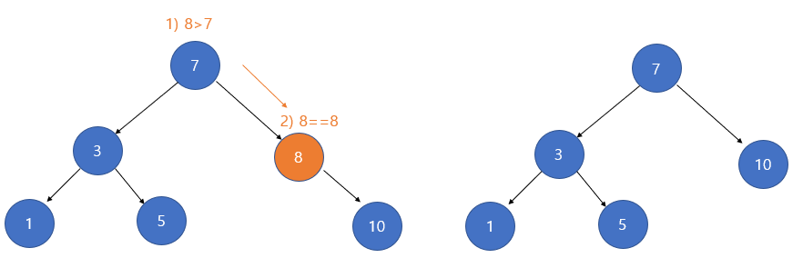 5가 7보다 작으므로 왼쪽 서브 트리로의 탐색이 이루어지고, 이후 5가 3보다 크므로 오른쪽 서브트리로 탐색이 이루어진다. 마지막으로 키가 5인 노드를 찾았으므로 탐색이 종료된다. 즉 트리의 높이인 3번 만큼의 탐색이 이루어졌다. 만약 8을 찾는다면 2번의 연산이 진행되었을 것이다. 즉, 트리 안의 값을 찾는다면 무조건 트리의 높이(h) 이하의 탐색이 이루어지게 된다.