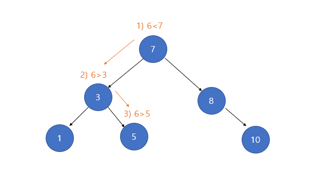 트리 안에 찾고자 하는 값이 없더라도 최대 h 번 만큼만의 탐색이 진행된다. 예를 들어 위 트리에서 6이라는 값을 찾는다고 하면 위 그림과 같은 과정을 거치고 탐색이 종료된다. (직접 위 그림에서 과정을 생각해보자) 마지막으로 탐색하게 되는 5를 키로 갖는 노드에서 6은 5보다 크므로 오른쪽 서브트리로 탐색을 진행해야 하는데 오른쪽 서브 트리가 없으므로 탐색이 종료되는 것이다.