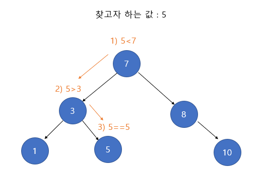위와 같은 트리에서 키가 5인 노드를 찾고자 한다면, 가장 먼저 루트 노드와의 비교가 이루어진다.