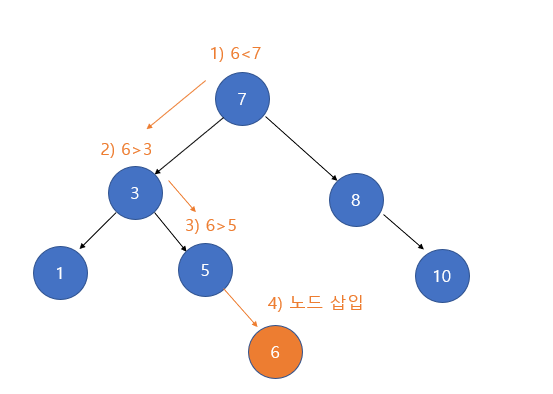 삽입할 위치가 5의 오른쪽 서브 트리인 것을 찾았으므로, 5의 오른쪽 자식으로 6을 추가하면 된다.
