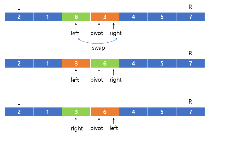 - 중간 값을 pivot으로 설정했다면 가장 왼쪽의 값을 left, 오른쪽의 값을 right로 잡는다. (여기서 L은 배열의 가장 왼쪽, R은 가장 오른쪽의 위치를 나타낸다)