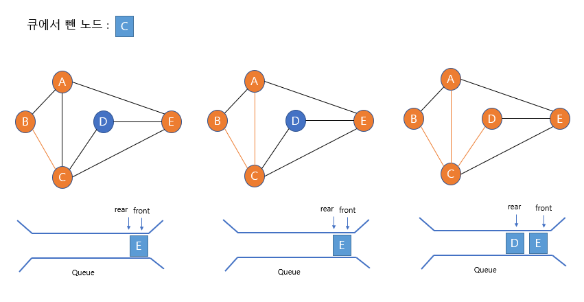 큐의 가장 앞의 노드를 빼고(C노드) 해당 노드의 인접 노드를 조사한다.