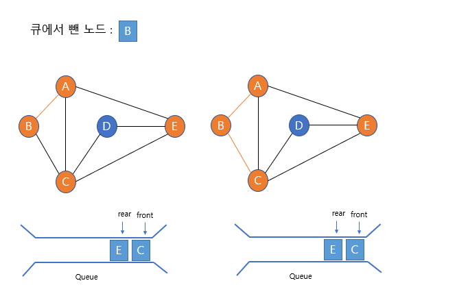 B노드는 이미 방문했으므로 방문하지 않고 큐에 넣지 않는다.