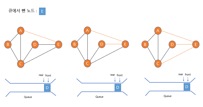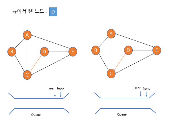 큐의 가장 앞의 노드를 빼고(D노드) 해당 노드의 인접 노드를 조사한다.