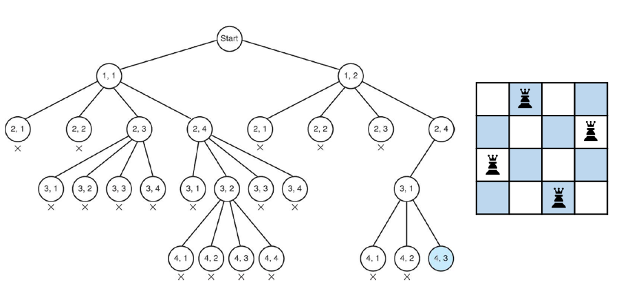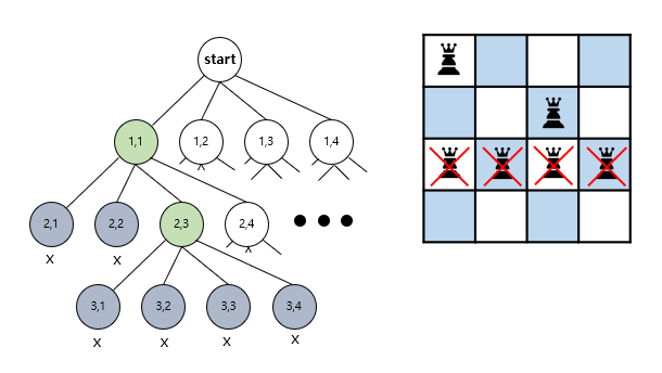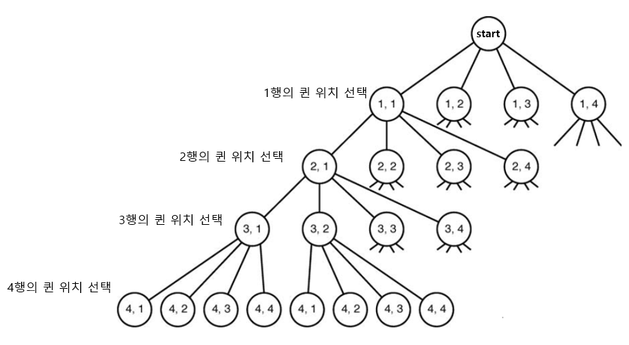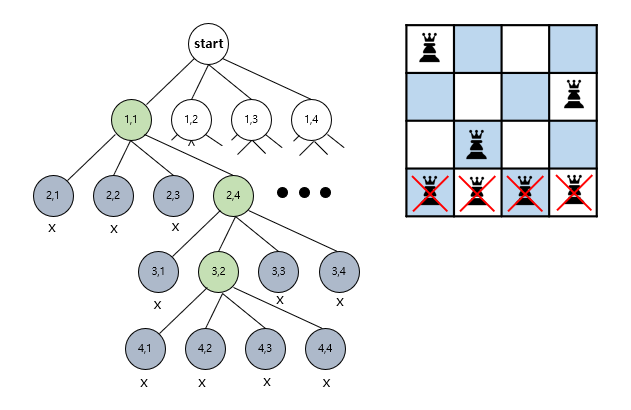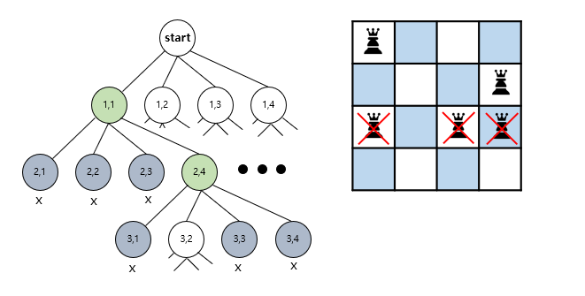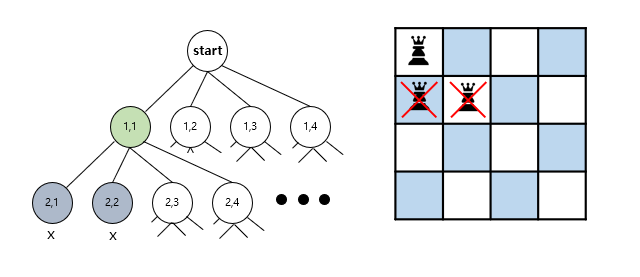 위 그림을 보면 4행에 어디에도 퀸을 배치 할 수 없는 것을 알 수 있다. 이 때 (1,1) 을 선택했을 경우 어떤 경우에도 퀸을 제대로 배치 할 수 없는 것을 확인했으므로 1행으로 돌아가 (1,2)를 선택한 후 다시 탐색을 진행하면 된다.