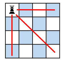 N-Queen 문제는 N X N 크기의 체스판에 N개의 퀸(Queen)을 서로 공격할 수 없도록 배치하는 문제이다. 이 때 퀸은 상하좌우, 대각선 방향으로 체스판의 끝까지 공격을 할 수 있다. 따라서 아래 그림처럼 직선, 대각선 상에는 퀸을 배치 할 수 없다.