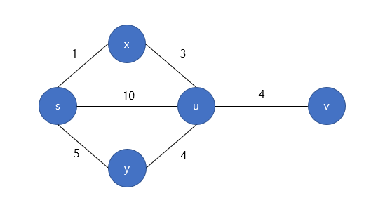 위와 같은 그래프가 있다면, s에서 v로 가는 최단경로는 D(s,v) = D(s,u)+W(u,v) 이다. 즉 s에서 u로 가는 최단경로에 u에서 v로 가는 비용을 더한 것이다. 따라서 1+3+4 = 8 이 될 것이다.
