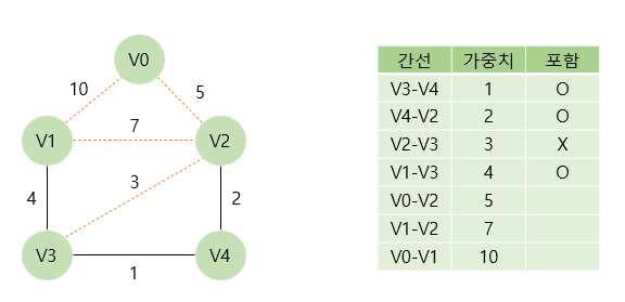 가장 먼저 V3와 V4를 연결하는 간선을 신장 트리에 포함시킬지 여부를 결정한다. 해당 간선을 포함해도 사이클이 발생하지 않으므로 포함시킨다.