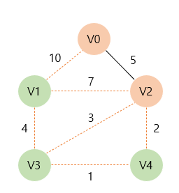 V0를 시작점으로 잡자. 이 때 V0는 T에 속하게 된다. 이후 T에 인접한 정점들 중 가장 가중치가 적은 간선으로 연결된 정점을 찾으면, V2가 5로 가장 작다.